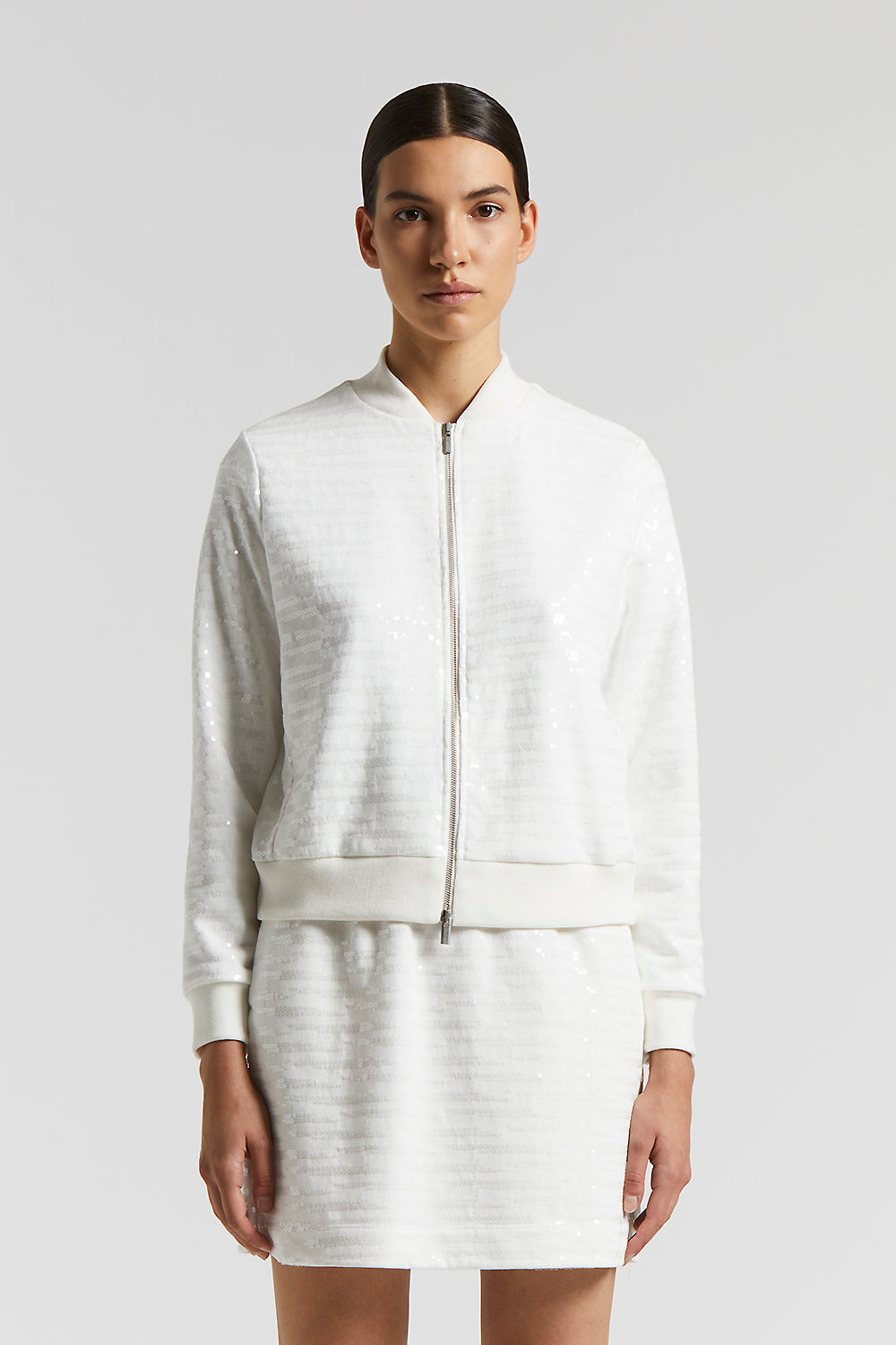 The bomber shape with zip fastening lends a sporty touch, while the all-over sequin embroidery enhances its feminine charm, creating subtle highlights.