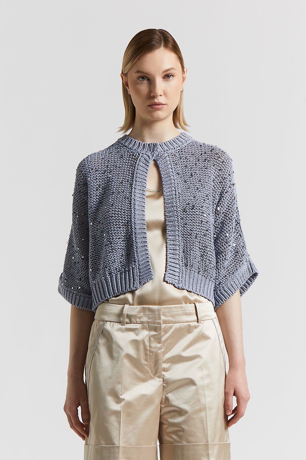 Made of fine cotton yarn, this cardigan with three-quarter-length kimono sleeves is embellished with maxi sequins that create enchanting, feminine plays of light.