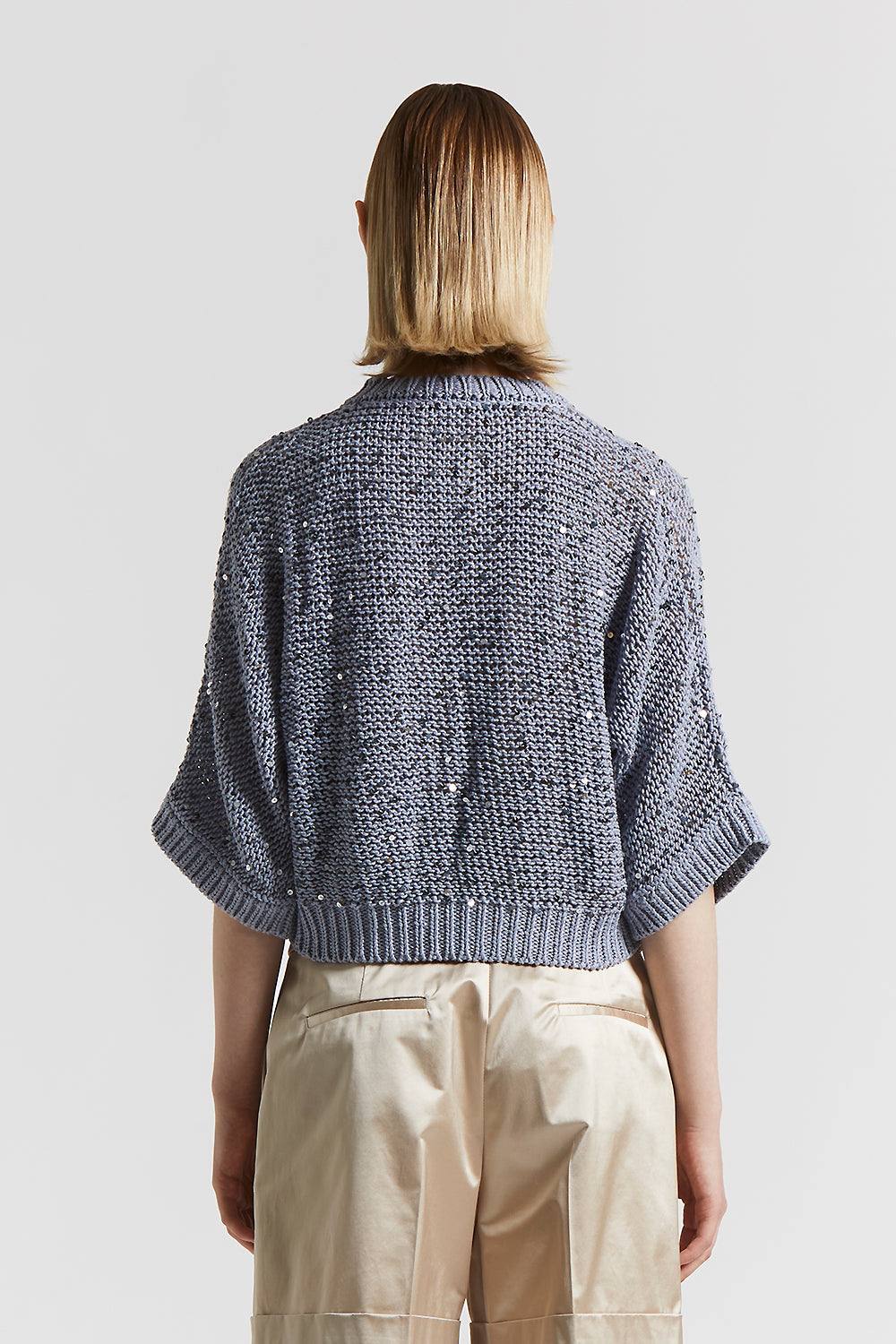 Made of fine cotton yarn, this cardigan with three-quarter-length kimono sleeves is embellished with maxi sequins that create enchanting, feminine plays of light.The purl stitch knit adds depth to the…
