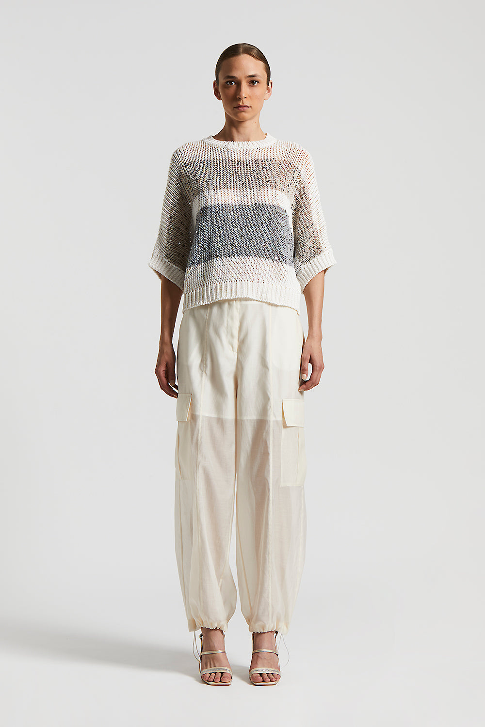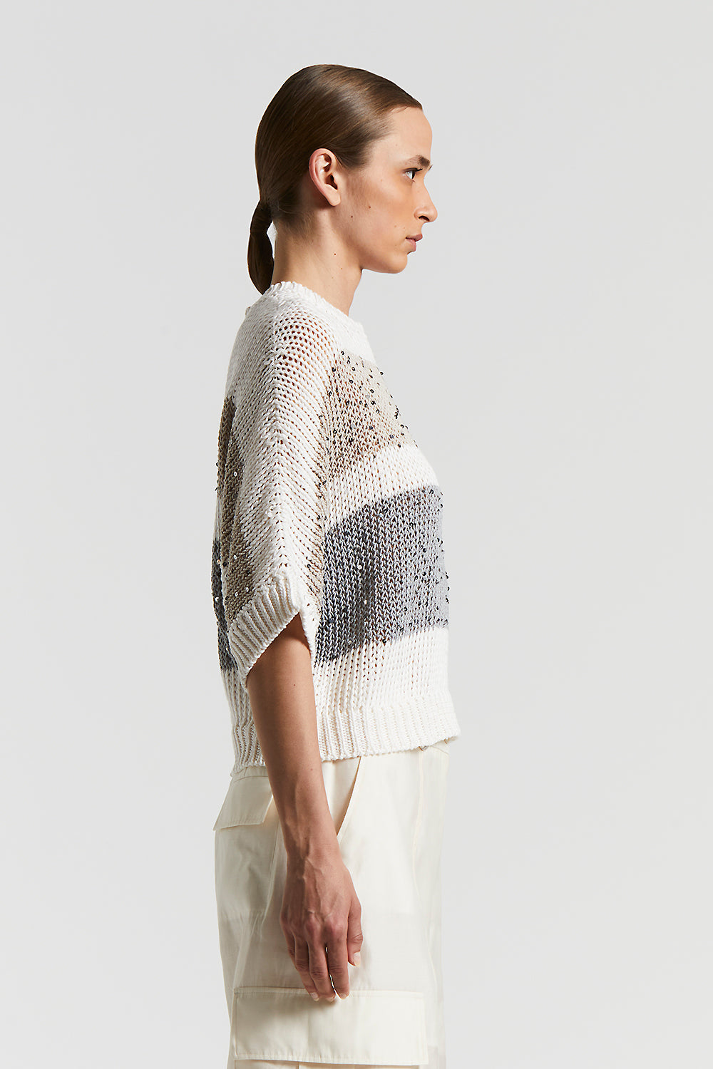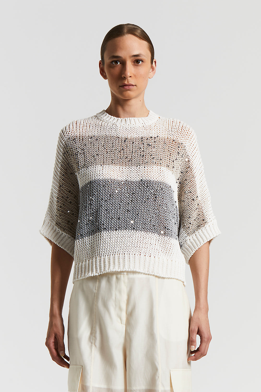 Peserico – Cotton ribbon striped sweater with sequins – Quartz sand