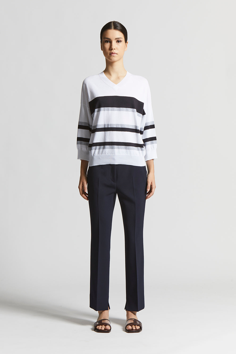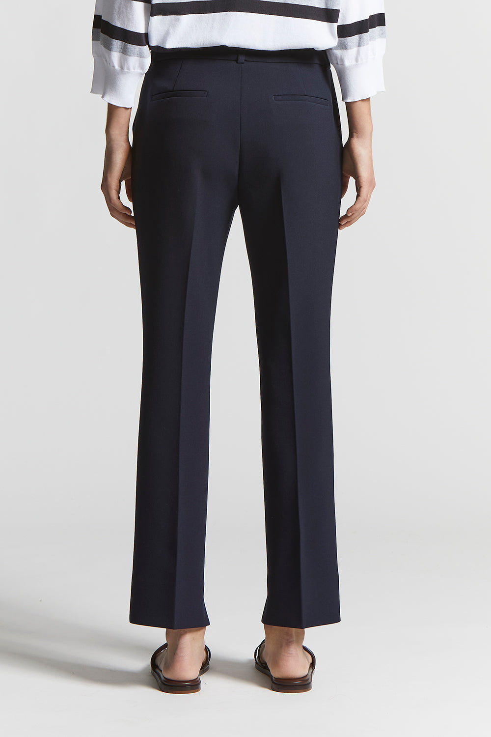 With its slim fit leg and slit bottom, these trousers express contemporary and timeless elegance.The high waist enhances the figure, while the stretch viscose-cotton double-knit fabric ensures a rich…