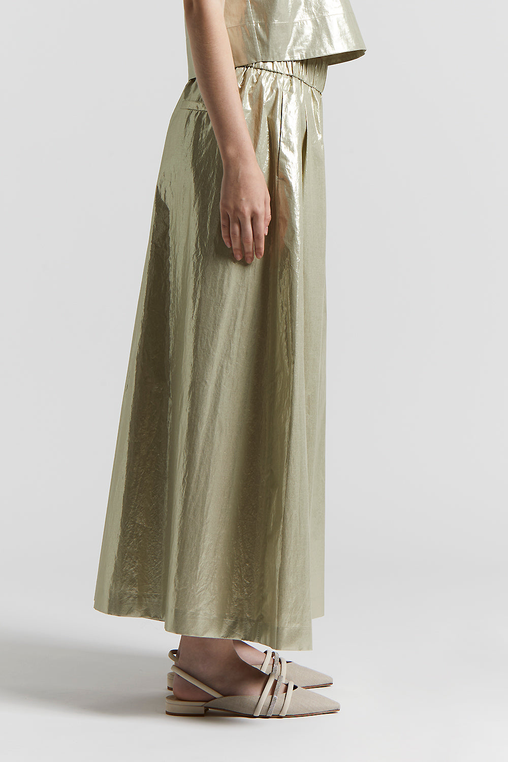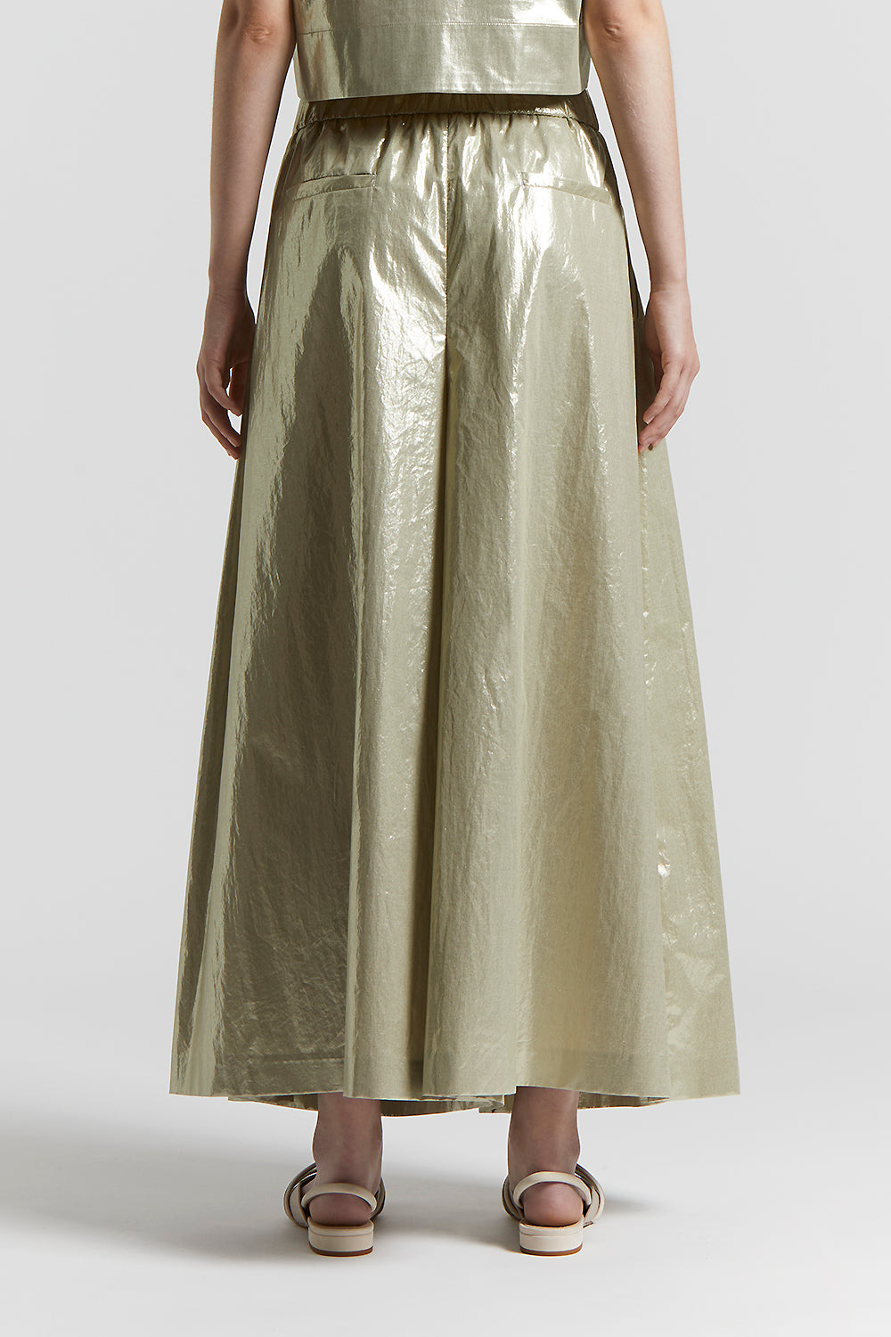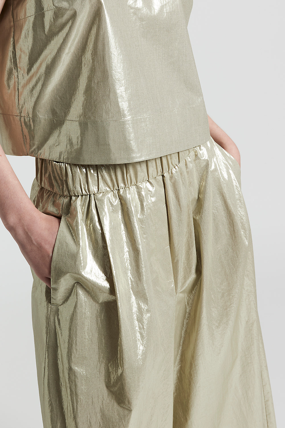 A perfect synthesis, these trousers are made of laminated cotton poplin, a fabric that combines the lightness of cotton with the shine of laminate for a glamorous and modern effect.