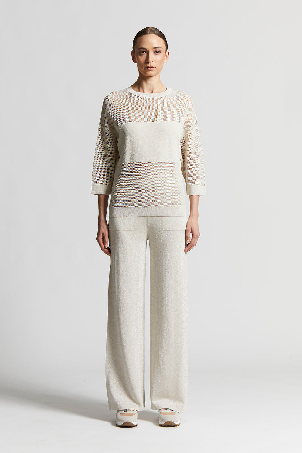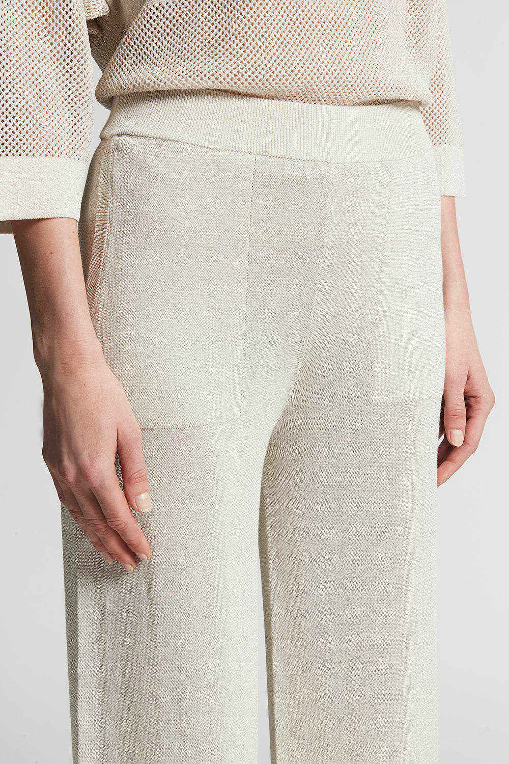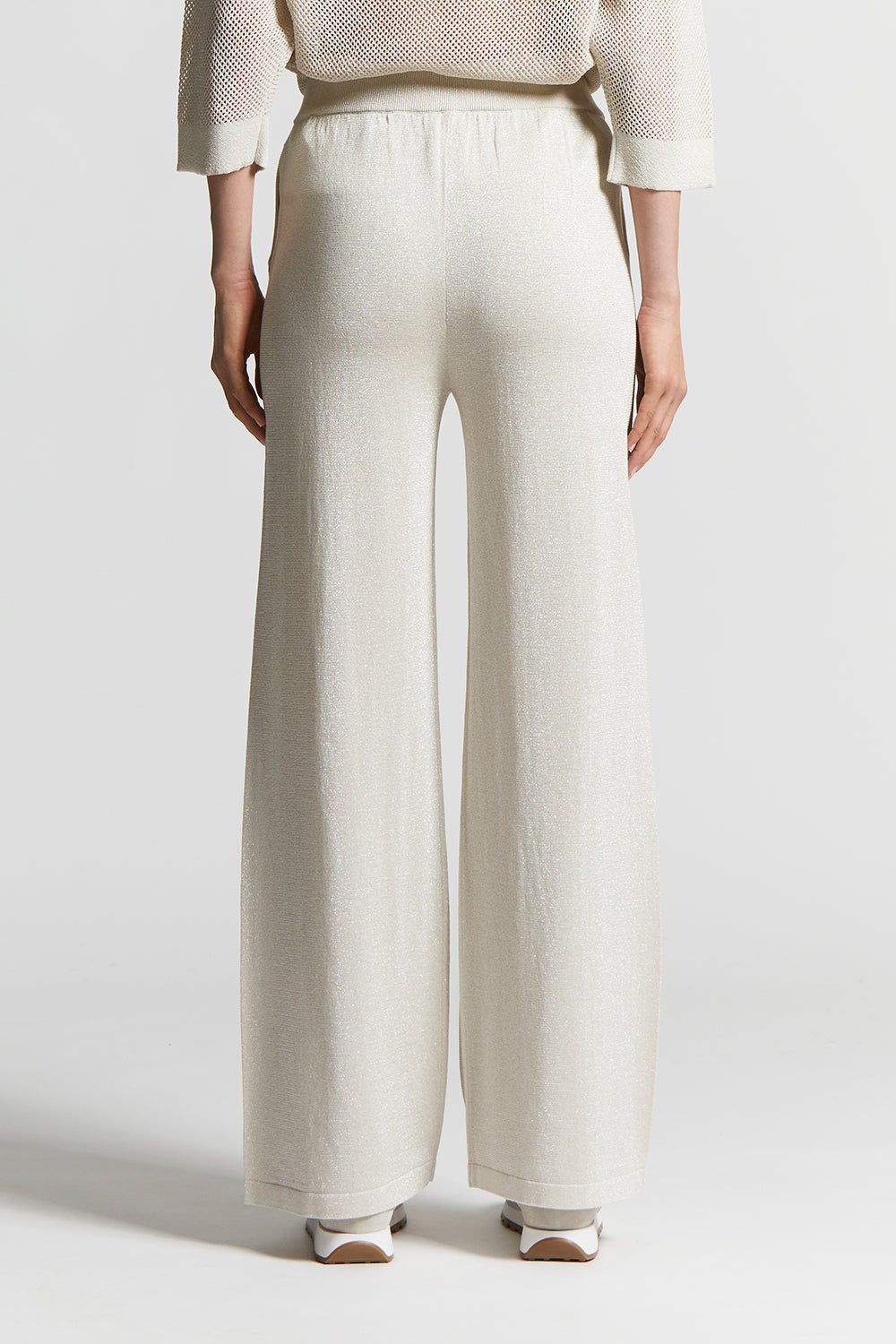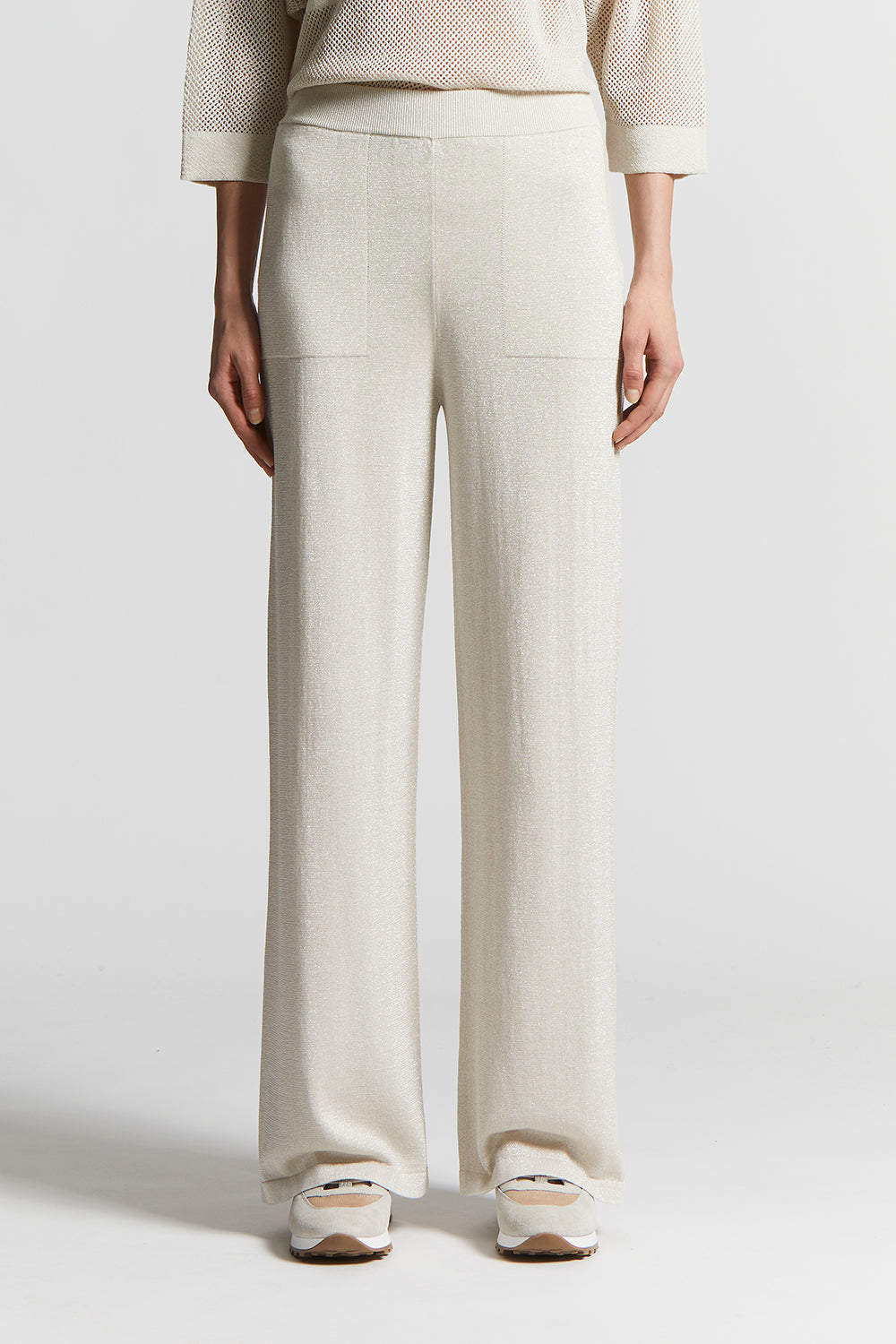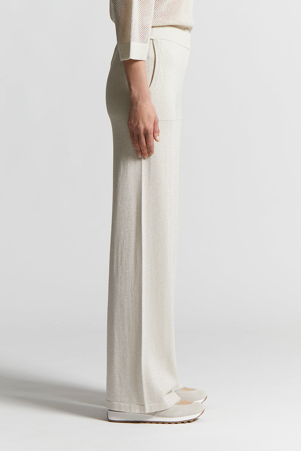 The convergence of a charming sheen and sophistication. These trousers in vanisé Lurex yarn feature a satin finish that enhances the weave and gives the garment a unique depth.The ribbed waist and he…